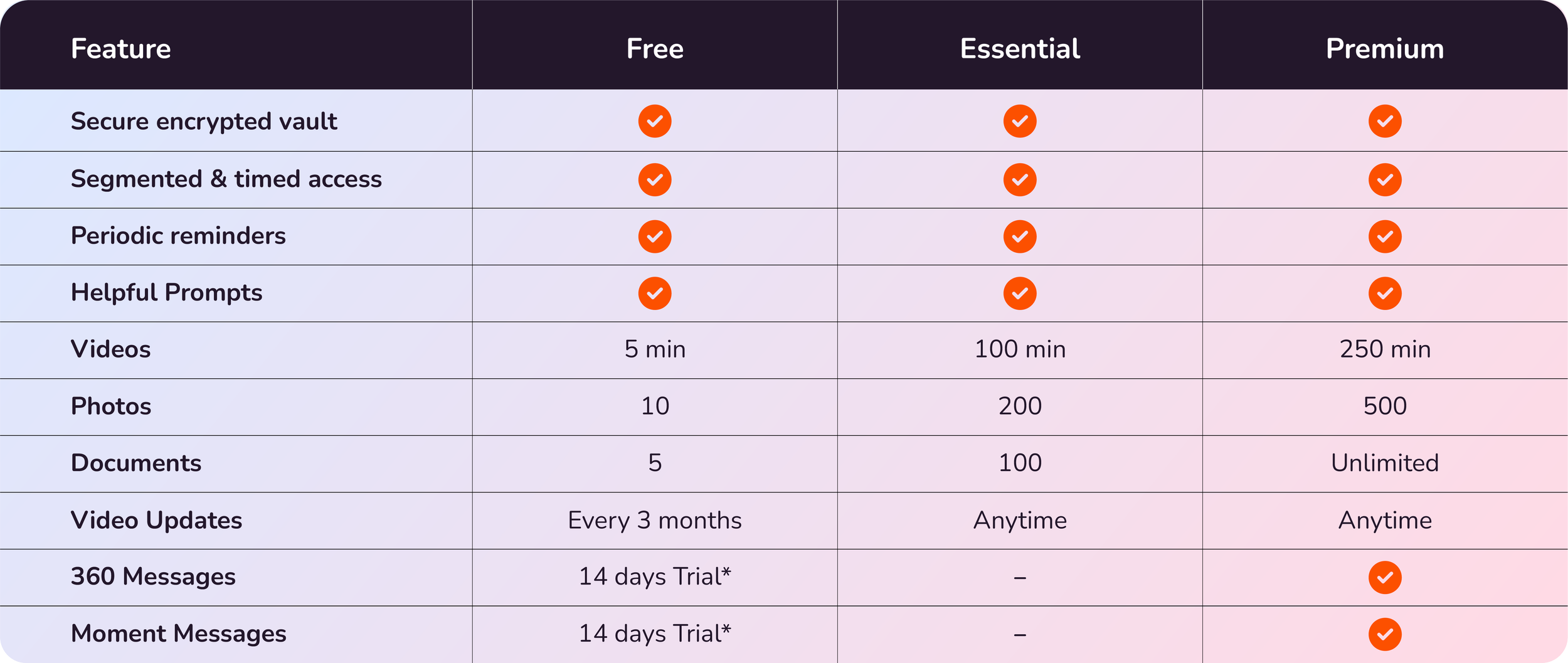 Choose a plan that suits your needs today, with the flexibility to grow as your story evolves. Our plans vary in feature access and the number of items you can store, giving you the freedom to start small or build a more complete vault over time.